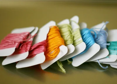 My sewing kit, a recycled Cadbury chocolate metal tin box always looks like a mess with bits and pieces of embroidery floss all clumped up like dog fur! Quite a frustrating sight to behold since I have to untangle a rainbow of thread before I get to start stitching anything. Anyway, I found this lovely organizing idea from this neat brazilian craft blog. There is a cute spool template that one can fashion into a felt spool. I made some from plain cardboard. Now my unruly embroidery flosses look quite a bit organised.
